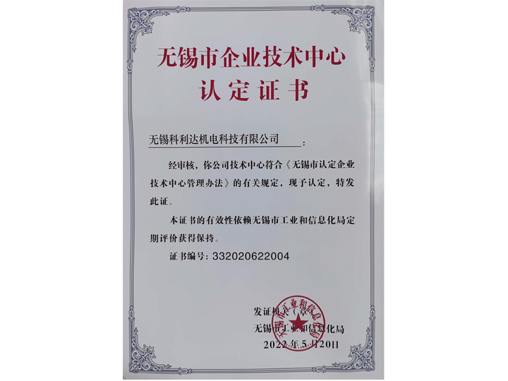 無(wú)錫市企業(yè)技術(shù)中心認(rèn)定證書
